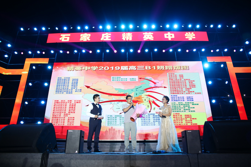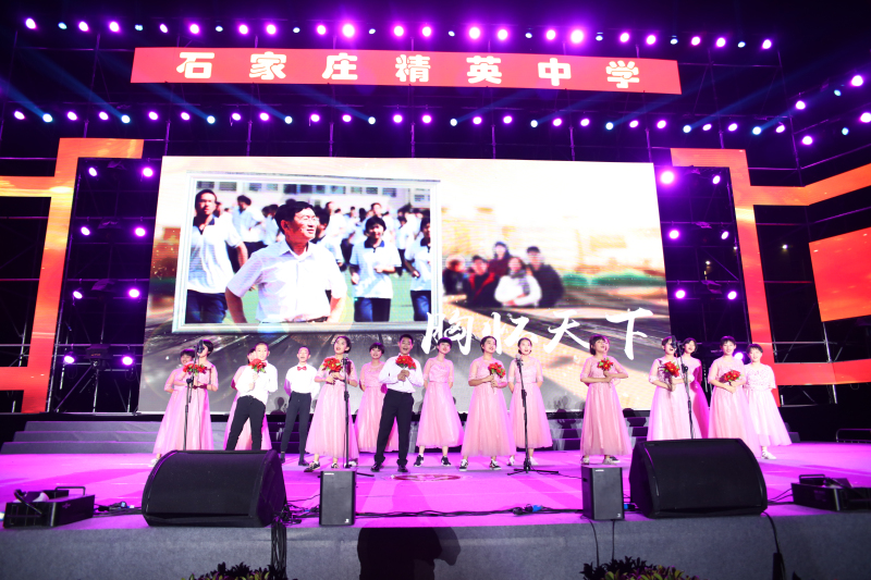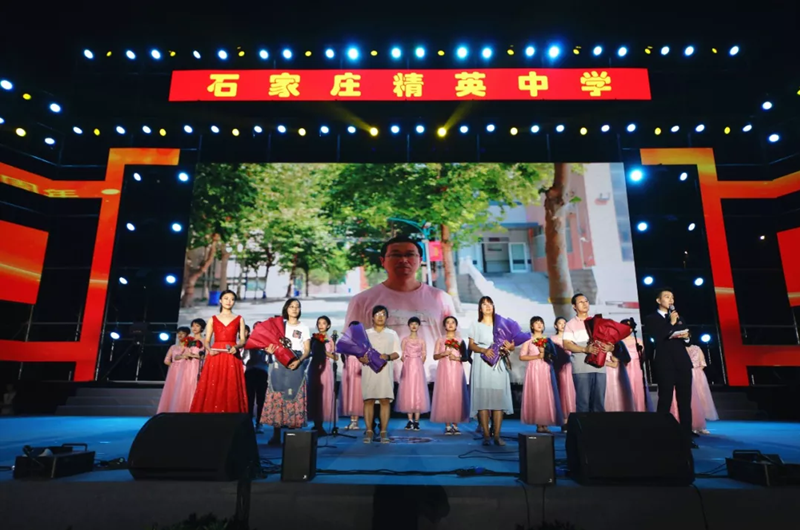 在这个特殊的日子里,演出现场出现了感人的一幕。学校把“最牛学霸班”的班主任魏胜强老师,带病坚持工作、爱岗敬业的先进典型易宁、范梦莎、李衬、孙晓宇老师请上舞台,表达对他们由衷的感谢和敬意。