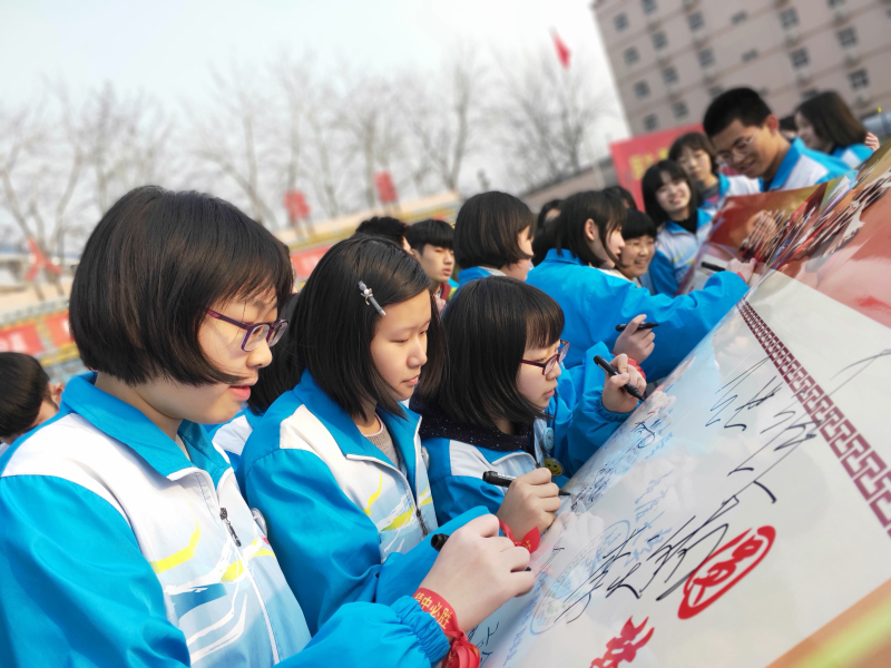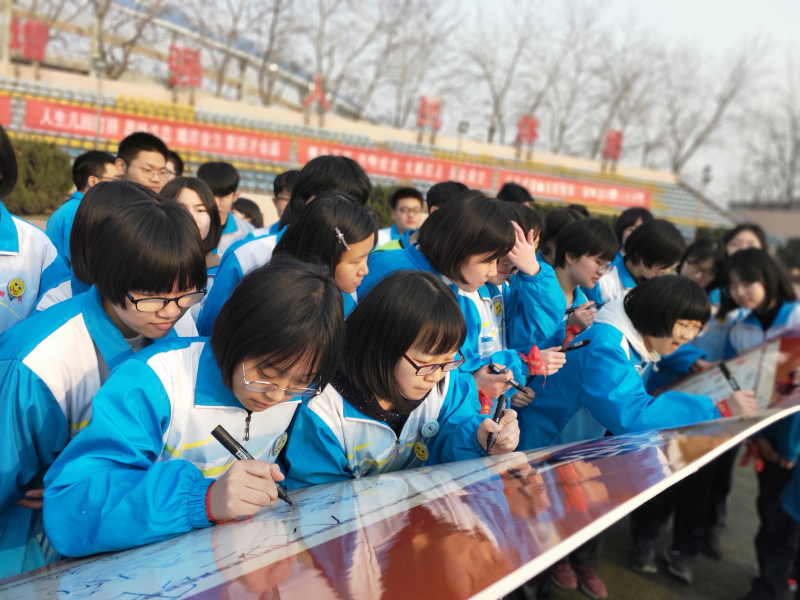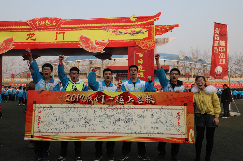 高三学子共同在“2019我们一起上名校”的展板上签字。
