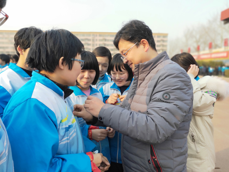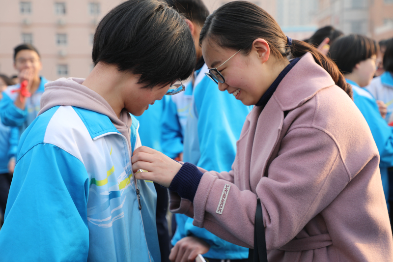 宣誓完毕,学校领导、高三老师走进各班级队伍,亲手为高三学子佩戴励志牌。