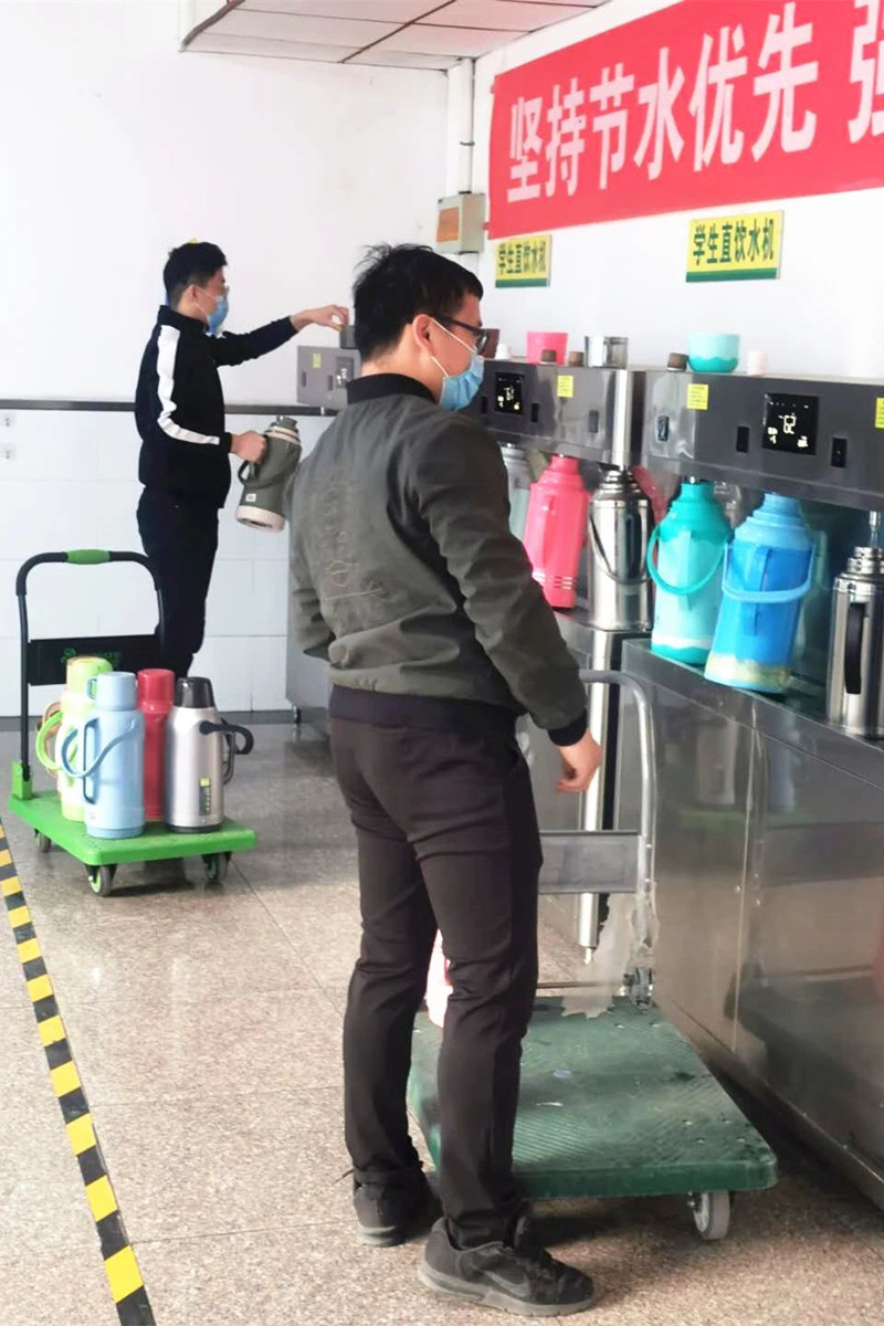 为了避免打水时有交叉现象,他推着小车一趟趟给学生打水。