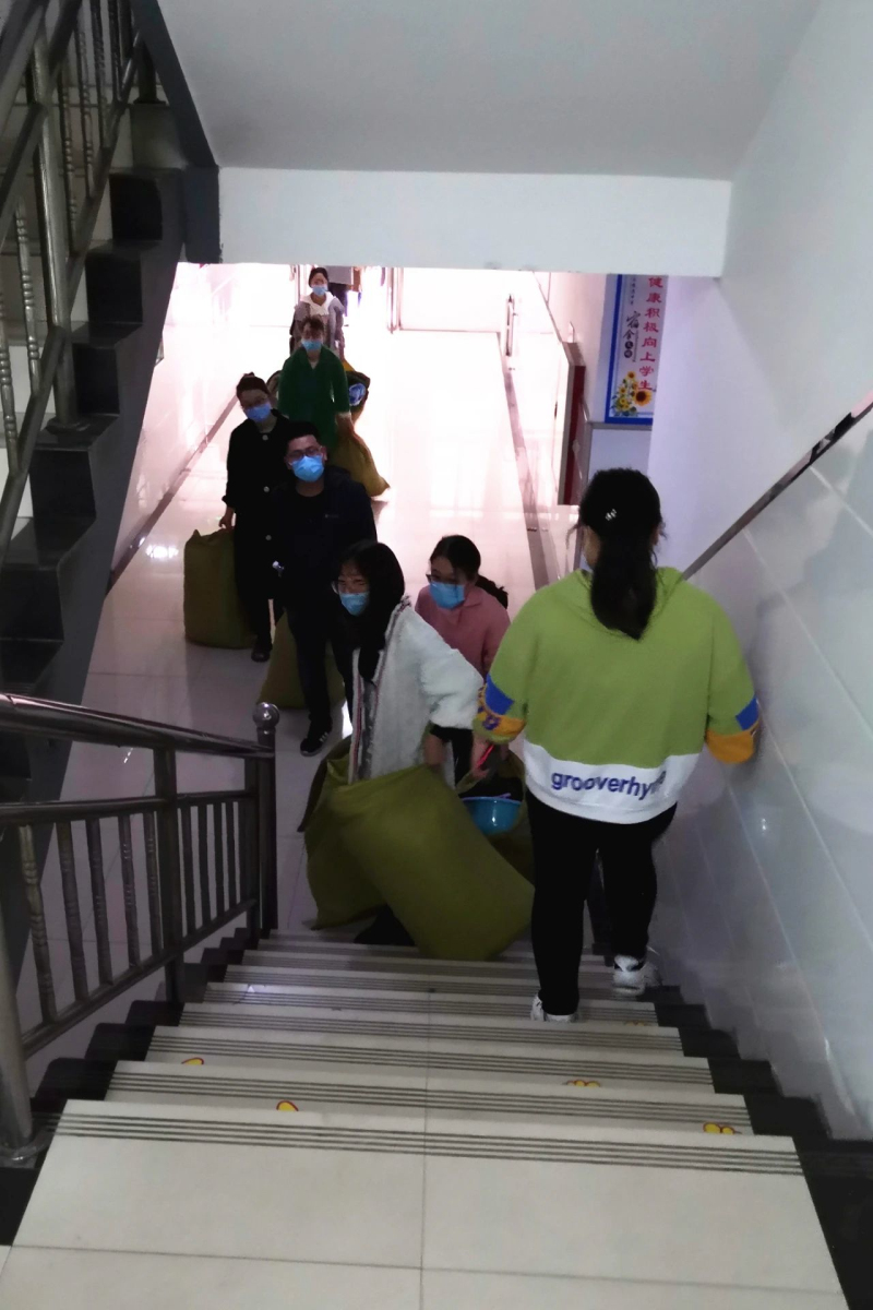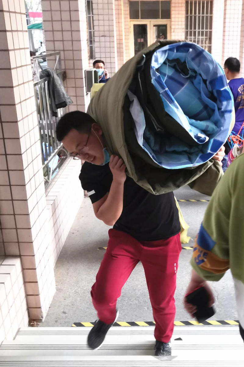 宿舍楼内,他带领着前来帮忙的老师们,搬运学生的行李。这些行李需要从4号公寓的一楼搬运到3号公寓的四楼。被褥、枕头、脸盆、衣物、鞋子……老师们包裹得特别仔细,生怕落下一点东西,给即将返校的学生造成不便。