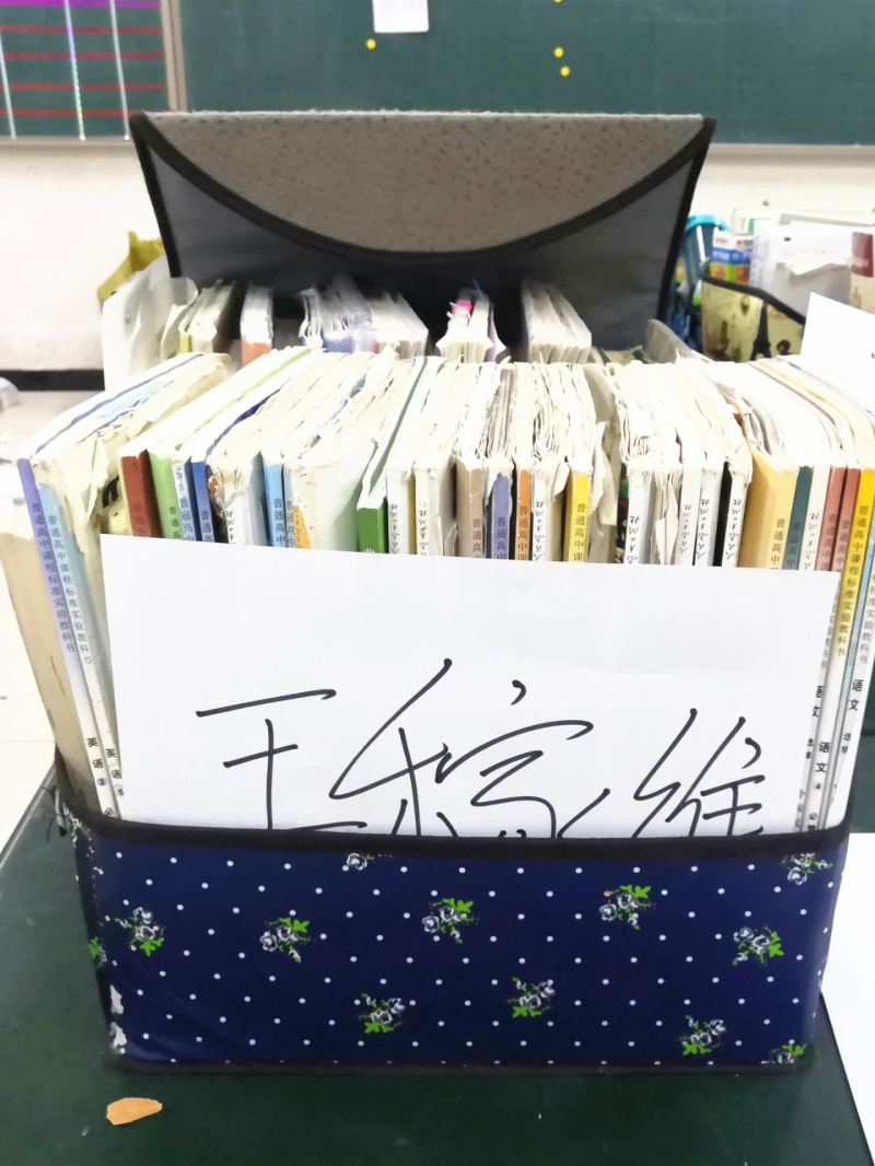 桌面和桌斗里的卷子、书本,要放进黄色的大袋子里;成箱的书,要贴上名字,用胶带缠绕结实;教室里公用的东西,要放到公共的袋子里。每一个袋子、每一箱书,他都标注清楚将要重新放置的教室。