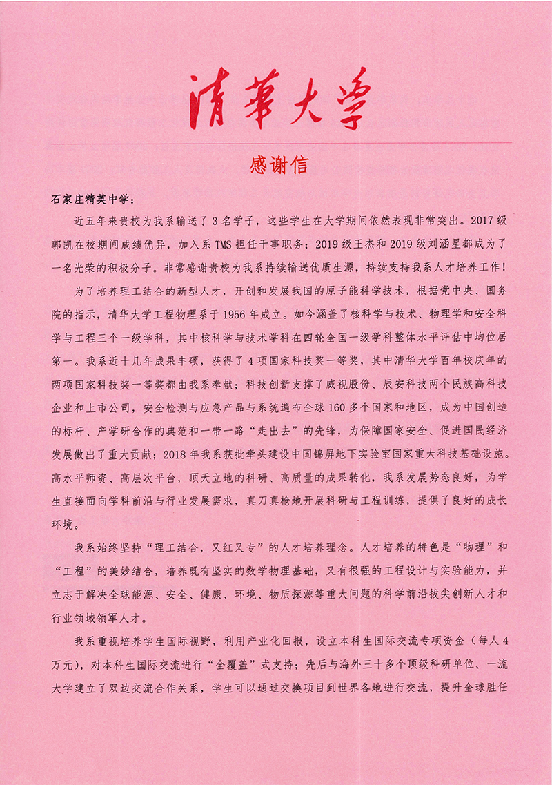 【概要描述】近日,清华大学工程物理系向石家庄澳门金年会app下载官网发来感谢信,感谢我校持续为其输送优质生源,持续支持他们的人才培养工作。