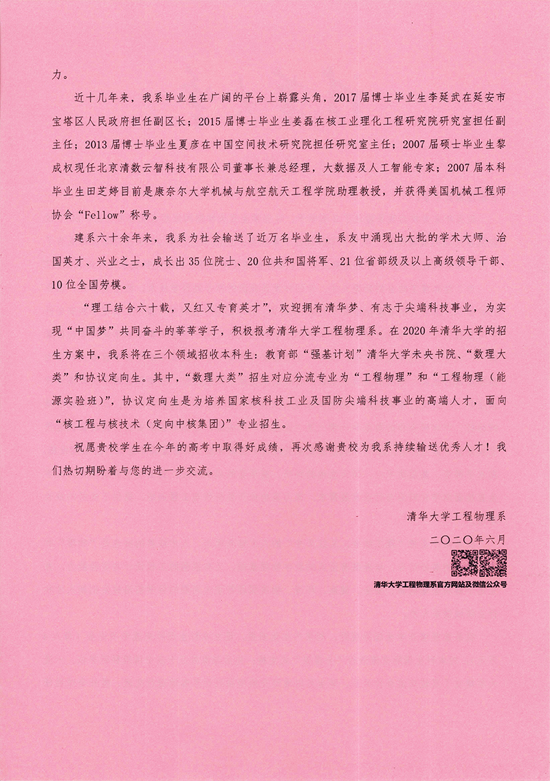 清华大学工程物理系衷心祝愿我校在2020年高考中取得好的成绩,并期盼与我校进一步加强交流合作。