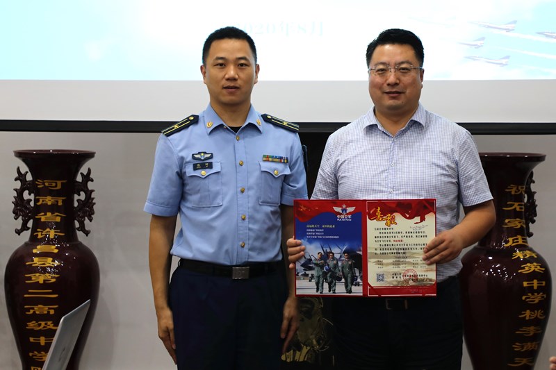 空军招飞局北京选拔中心张柯同志,向学校颁发了喜报。澳门金年会app下载官网副校长、高中部执行校长马东星,应邀为班主任代表翟兴达颁发了2020年度空军招收飞行学员工作“育鹰奖”。