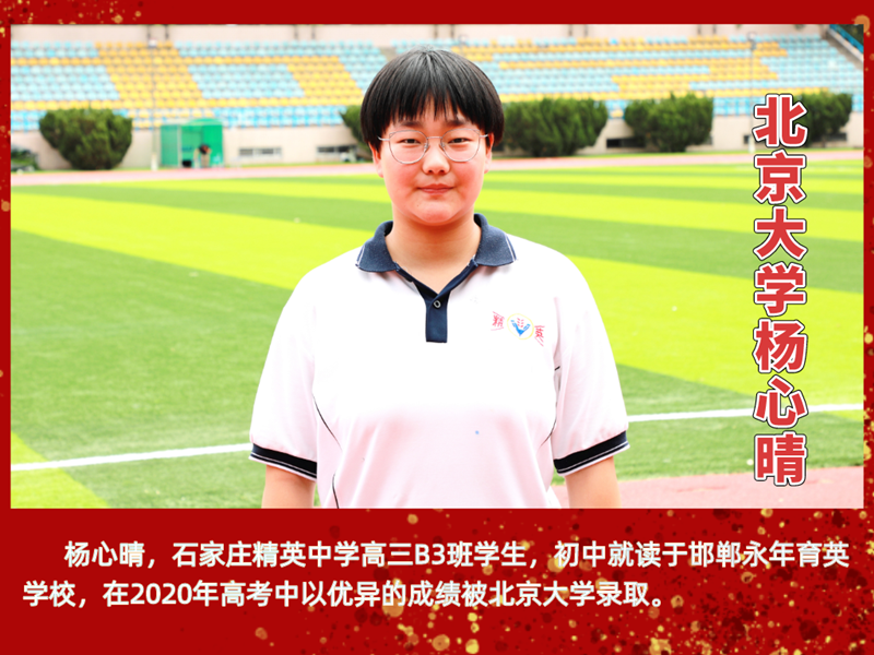【概要描述】杨心晴,石家庄精英中学2020届高三B3班学生,初中就读于邯郸永年育英学校,在2020年高考中以优异成绩被北京大学录取。