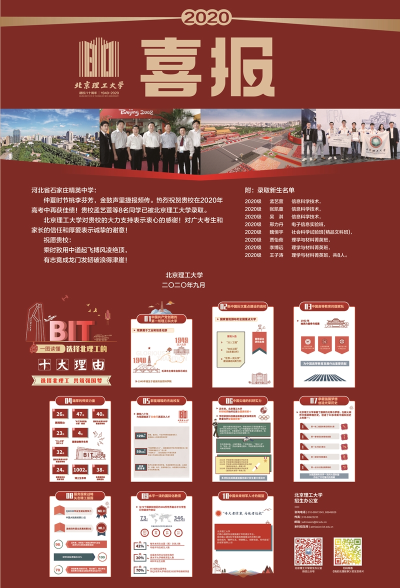 北京理工大学祝贺我校在2020年高考中再获佳绩,感谢我校对北理工的大力支持及澳门金年会app下载官网考生和家长对北理工的信任和厚爱。