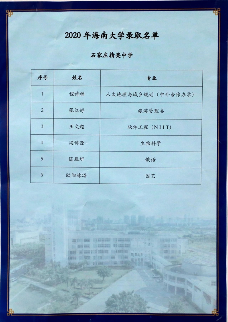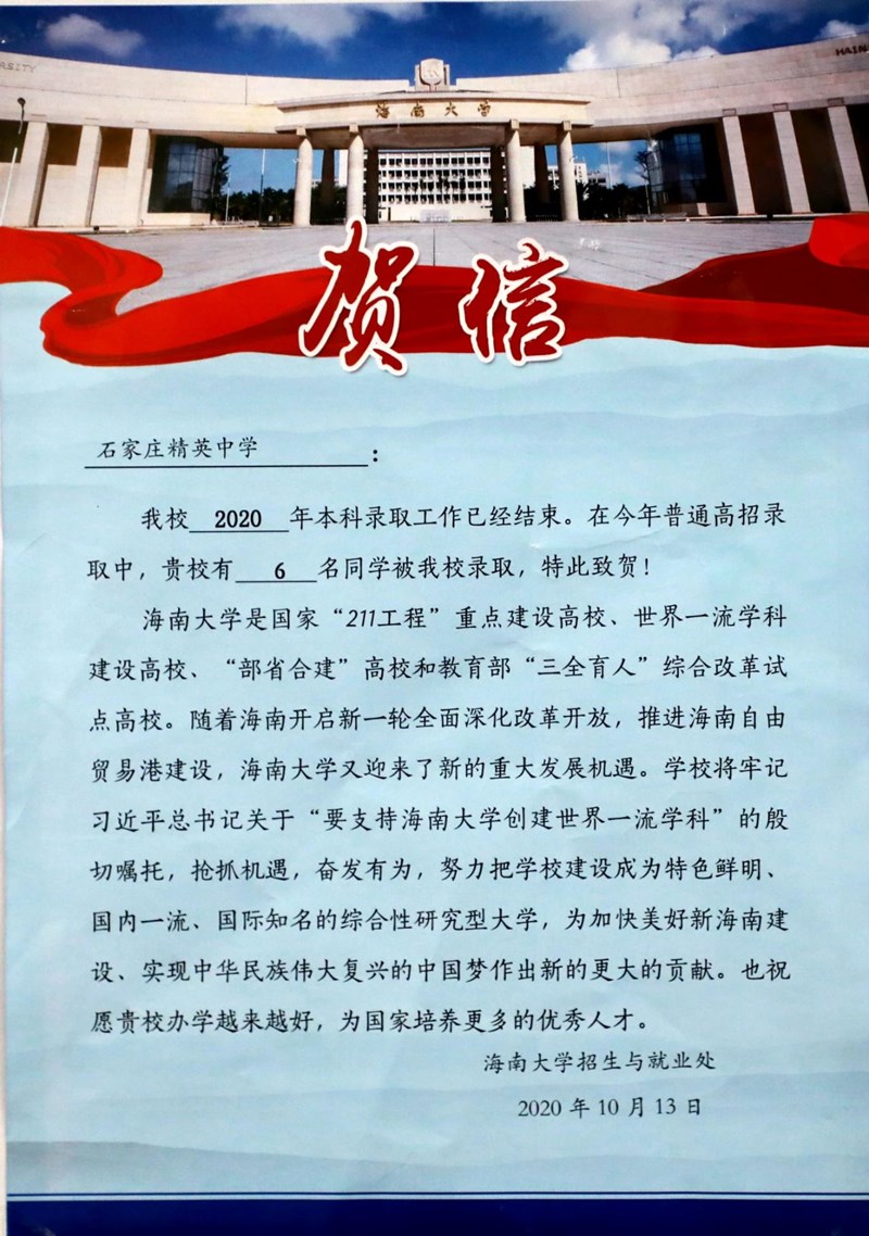近日,国家“211工程”高校海南大学向澳门金年会app下载官网发来喜报,祝贺我校程诗锦、张江婷、王文超、梁博源、陈慕妍、欧阳林涛等六名同学被海大录取。
