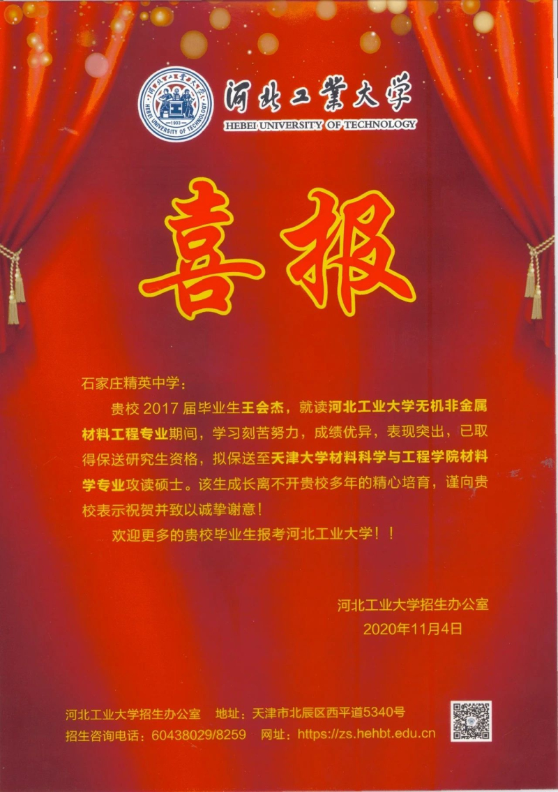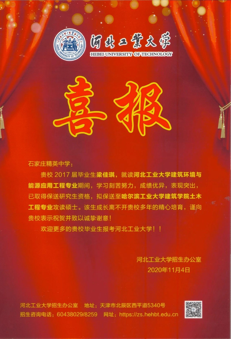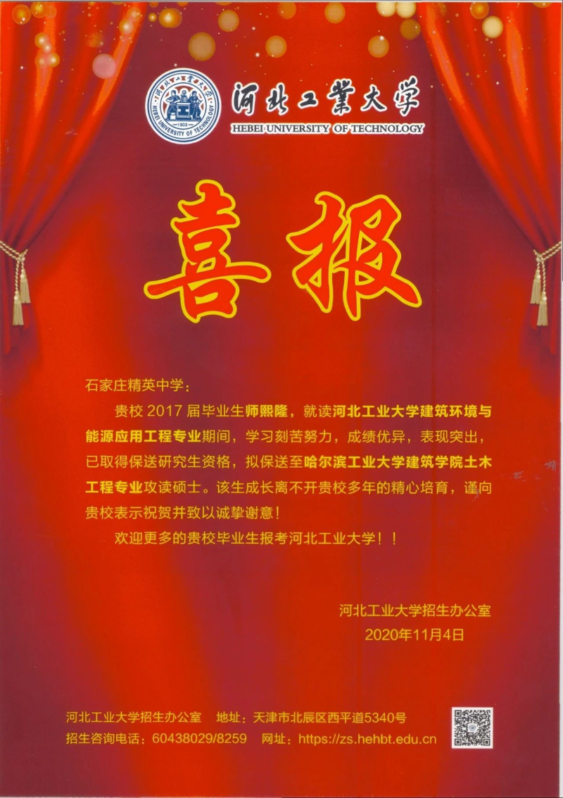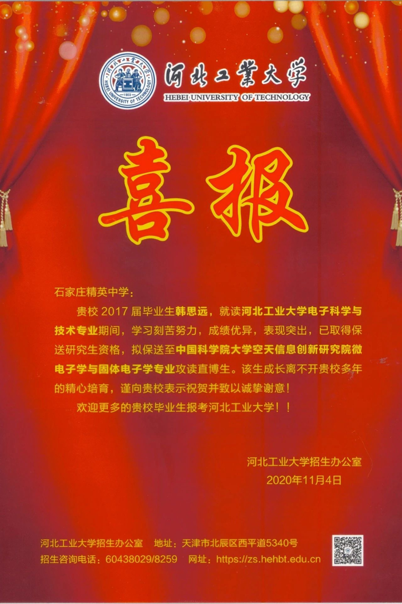 喜报称,这些同学在河北工业大学就读期间,学习刻苦努力,成绩优异,表现突出。韩思远代表同学们感谢母校的培养和付出,希望母校未来能够因他们的成长而骄傲和自豪!