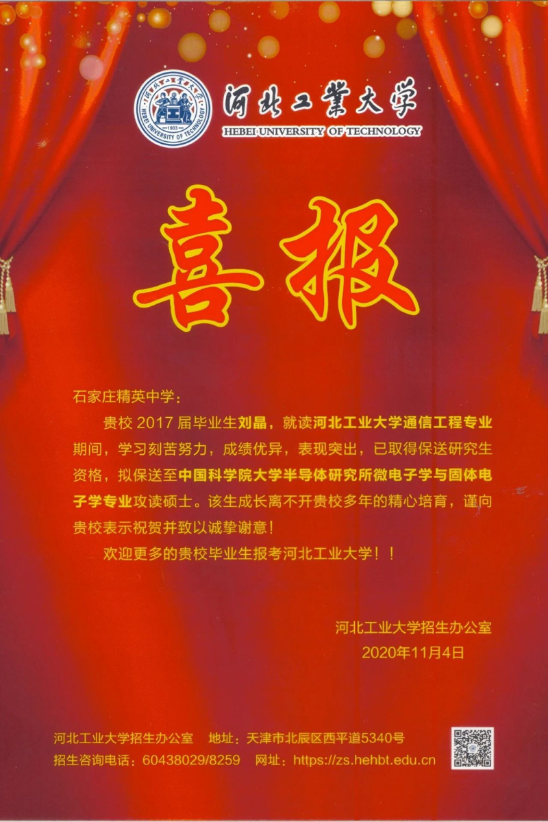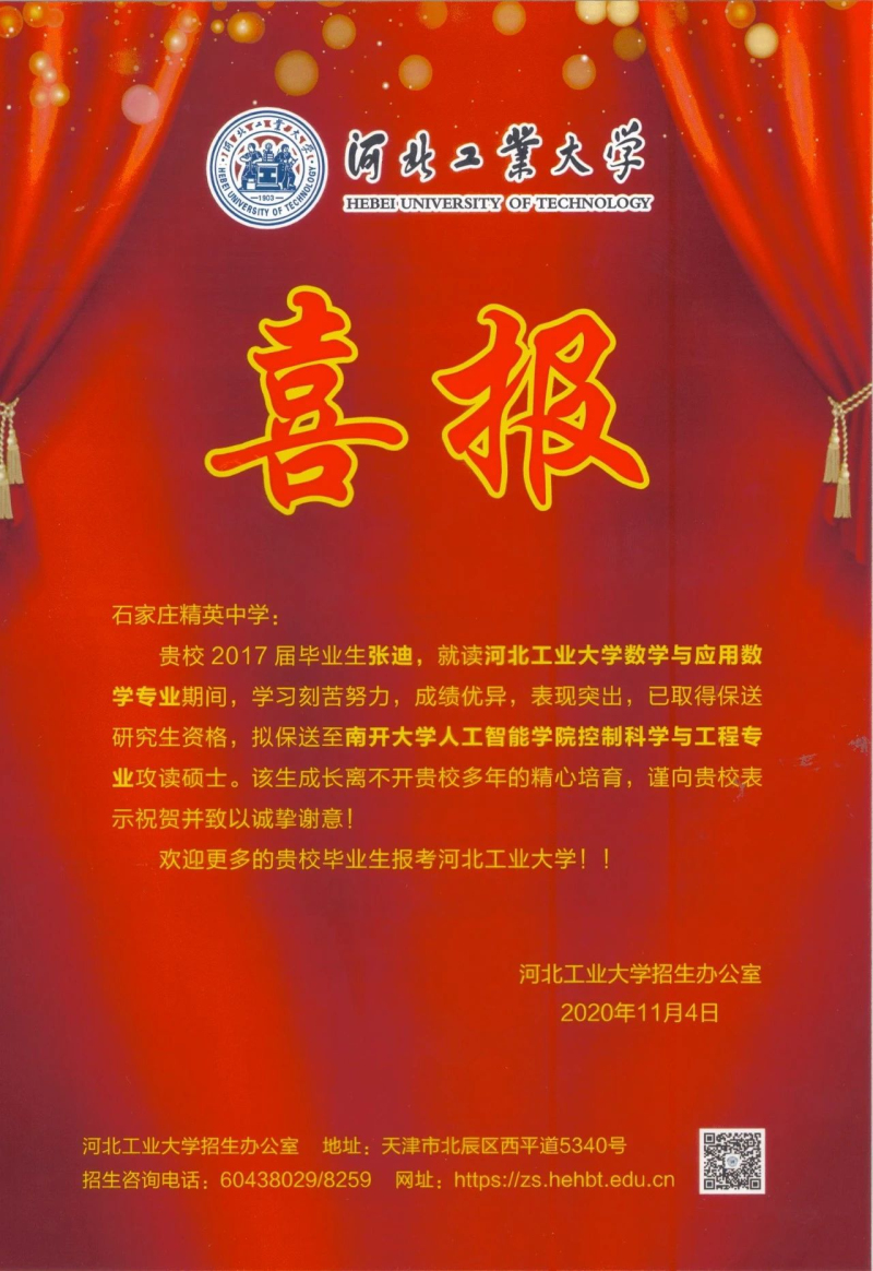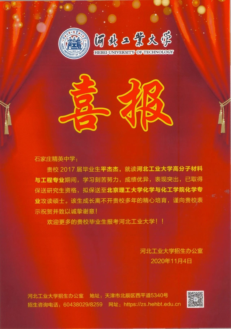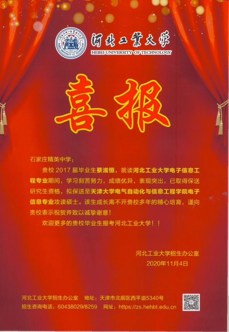 喜报称,这些同学在河北工业大学就读期间,学习刻苦努力,成绩优异,表现突出。韩思远代表同学们感谢母校的培养和付出,希望母校未来能够因他们的成长而骄傲和自豪!