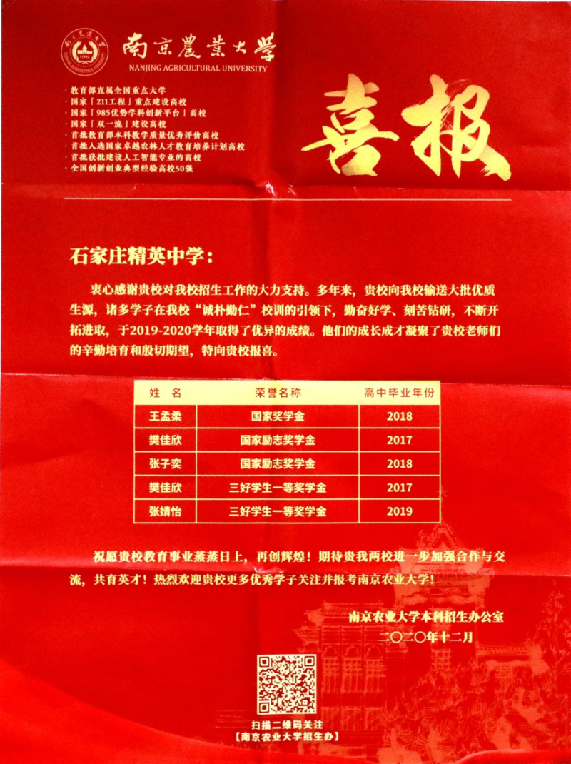 近日,国家“211工程”“双一流”建设高校华中农业大学、南京农业大学、河北工业大学陆续向澳门金年会app下载官网发来喜报,对澳门金年会app下载官网毕业生在大学期间取得的优异成绩表示祝贺,对澳门金年会app下载官网老师们的辛勤培养表示感谢。