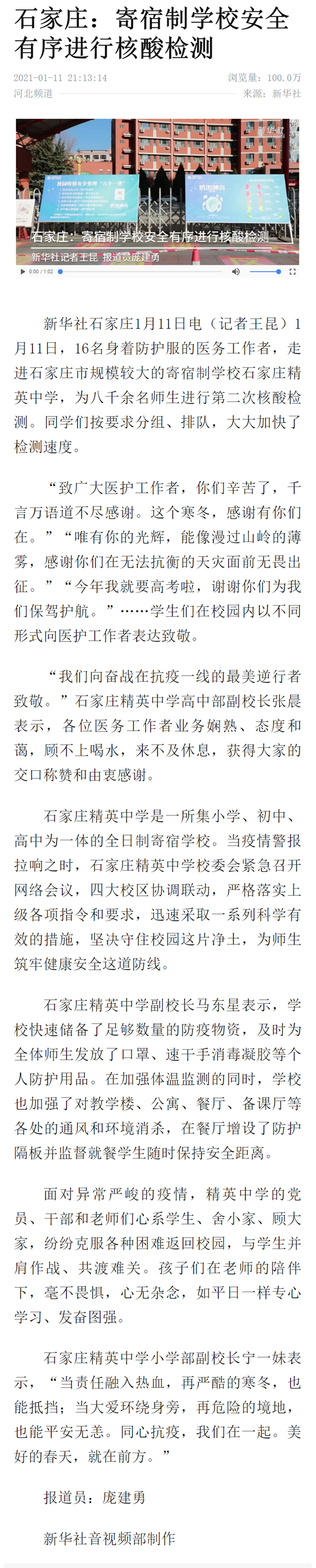 1月11日,新华社以澳门金年会app下载官网作为省城寄宿制学校的典型代表,报道了我校安全有序进行核酸检测、科学精准防控新冠疫情和澳门金年会app下载官网学子专心学习、发奋图强的正能量,获得社会各界极大关注,浏览量在短短时间内就突破100万。