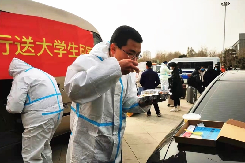 第二个故事,是哈喽优行志愿车队的队长,他叫范越甲。我见到他时,因为每天只睡三四个小时,他的一只眼睛红肿很严重。两点半,他返回火车站给车充电的时候,才扒了一口饭。因为封闭隔离和公共交通暂停,很多紧急情况,如医护人员上班、患者就医、学生寒假返家等,需要应急车辆,群众用车需求量很大。范队长既是整个志愿车队的协调者,也是志愿司机。志愿车队每天奔忙在城市各个角落,为这些急需群众免费服务,从最开始的50人,到后来200人、400人,现在已经有600多人加入。