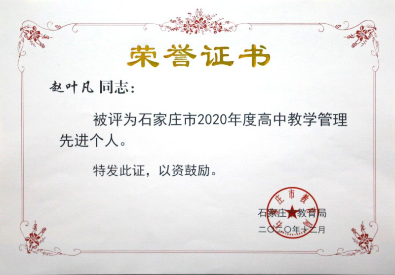 在石家庄市教育局组织的2020年度全市高中教育工作先进单位及先进个人的评选活动中,我校再次荣获“高中教学先进单位”荣誉称号。陈席席、赵叶凡两位老师分别获得“石家庄市2020年度高中教学管理先进个人”荣誉称号。