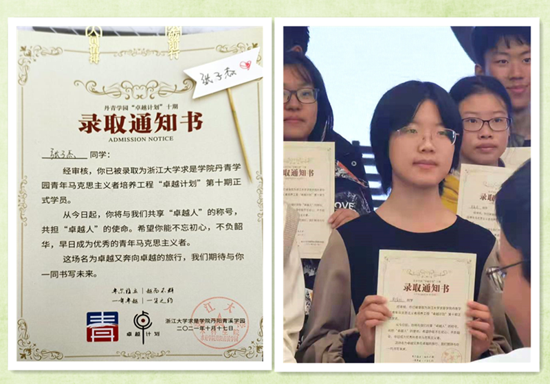 不久前,张子杰经过选拔成为浙江大学求是学院丹青学园青年马克思主义者培养工程“卓越计划”第十期学员。她说:“真正卓越的人从来不会空想——眼中有光、肩上有责、脚下有力才是卓越者的姿态。站在两个一百年的历史交汇点,我愿意接过历史重任直面挑战:这四年,我们这一批‘卓越人’又将达到怎样的高度呢?”