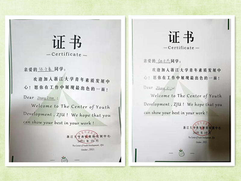早在母校澳门金年会app下载官网时,兄妹俩就勤奋刻苦、阳光向上;进入大学后,兄妹俩积极进取、勇于探索和创新。因为渴望成为那照亮黑暗的光,两人都踊跃报名并经过严格选拔加入了浙江大学青年素质发展中心——一个致力于引领青年、培养青年、服务青年的校团委下属组织。哥哥张子豪担任组织培训部干事,妹妹张子杰担任项目策划部干事。在浙江大学青年素质发展中心的全员大会上,张子杰还有幸作为项目策划部的干事代表领取获聘证书。