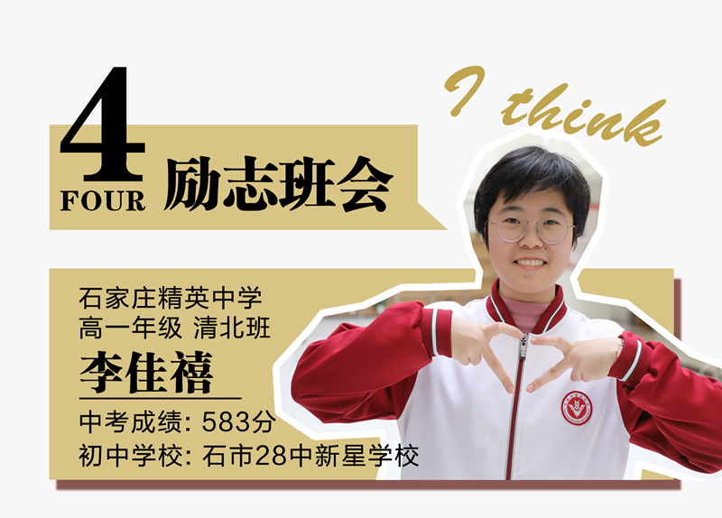 每天上午激情跑操后,会有一个励志小班会,时长约十分钟。如果此时你行走在校园中,你会听到老师的妙语连珠,同学们或严肃认真,或欢声笑语,常有同学自告奋勇,化身演说家,落落大方,大放异彩。最振奋人心的是庄严宣誓,我们一起喊出心中的热切渴望。励志小班会,给我们补充着源源不断的正能量,让鲜衣怒马的我们自信张扬。