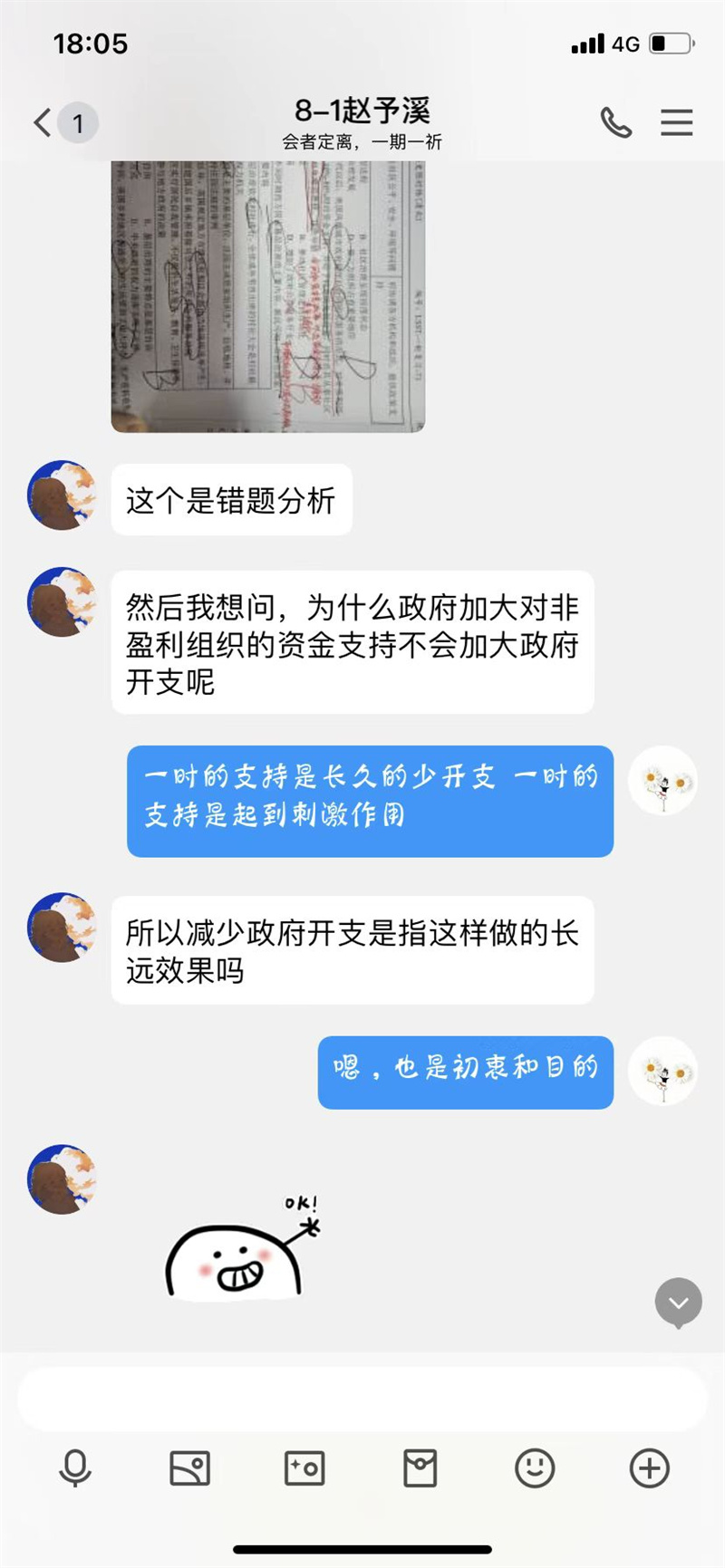 再说课堂,学校最大程度还原了线下高效6+1课堂的形式,我们小组每个同学都会不断地提出一些有趣的问题来进行探讨,每个人的积极性都非常高,这个过程中既有对题目深层次的思考,又有解决问题的喜悦,我认为我所在的小组很大程度的还原了学校中课堂上的议环节,这也让我从中获益许多。